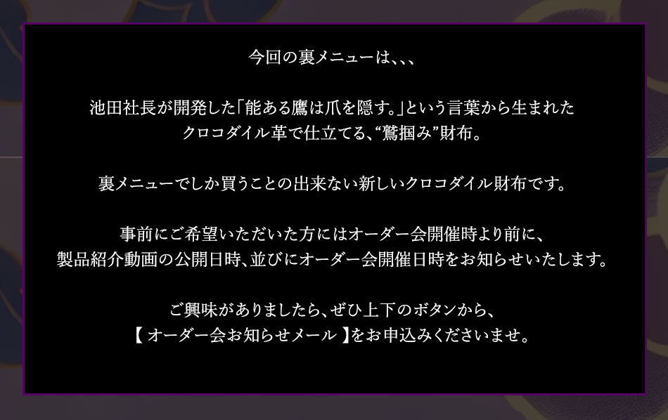 こちらの作品はご好評いただき、ただいま完売しております。 ▼ 次回オーダー会「ご案内メール」お申込み受付中 ▼ こちらの作品は、多くの反響いただき、ただいま完売しておりますが、 次回オーダー会開催に向けて準備を進めております。 *「ご案内メール」ご希望を頂戴した方のみの限定オーダー会とさせて頂く場合もございますので、 ご興味のある方はぜひお気軽にお申込みくださいませ。 |